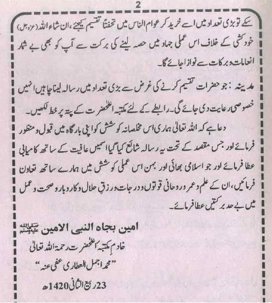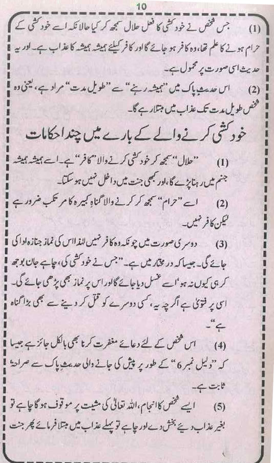 - Fatwa in Durre Mukhtar: "Although one who commits suicide, will burn in hell forever, but the deceased was a Muslim before doing this act and he will be buried as per normal Muslim traditions. Such a person will be given Ghusl, Janaaza Salaat and burial in a Muslim cemetery as is the case with any other sinful Muslim. "