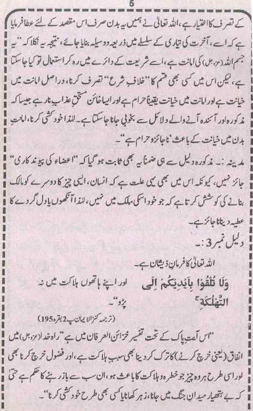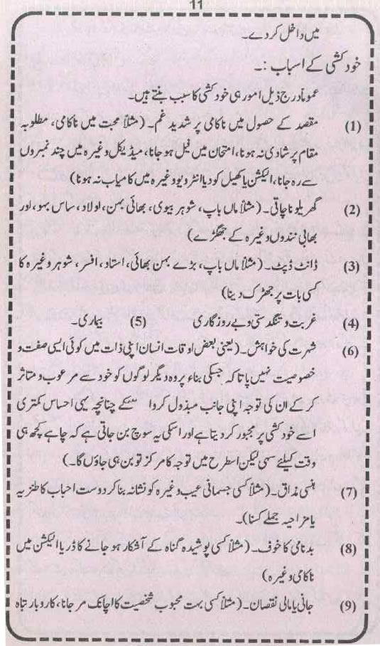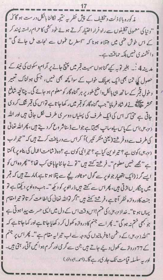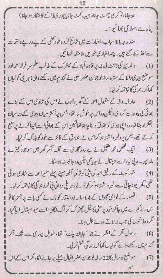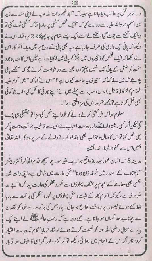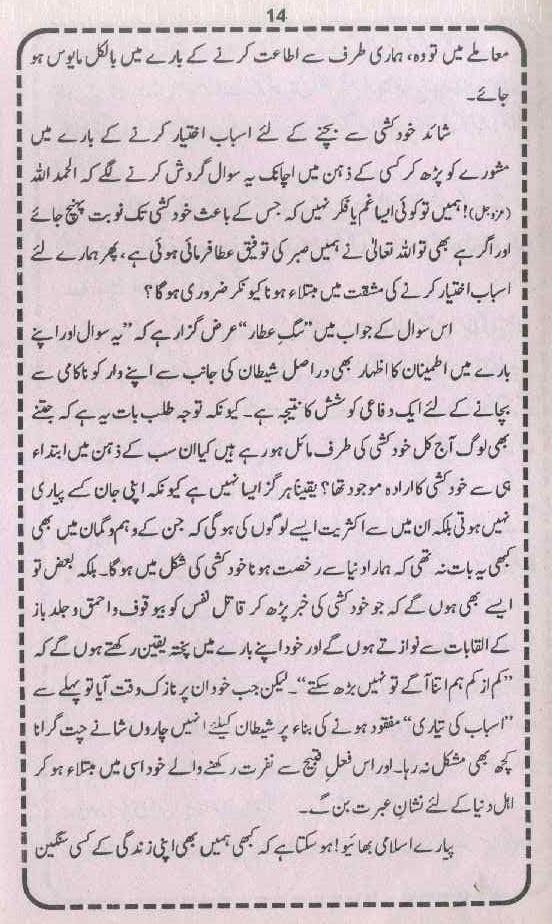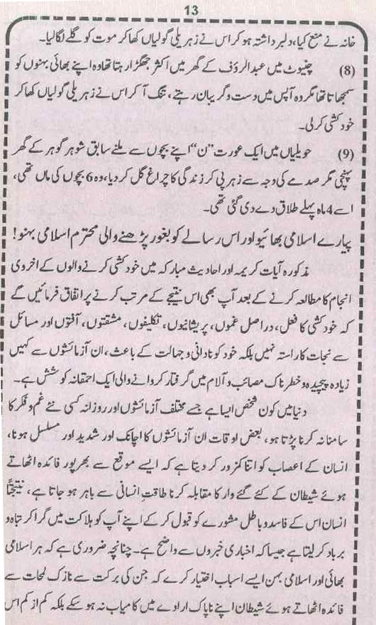 Why are you reading this section on suicide? Are you planning to commit suicide or are you researching on the subject that why do people commit suicide? Here you will find answers to all those questions relating to suicide. First, we have collected an Urdu book on this subject. Secondly, you will see a brief, yet comprehensive collection of Quranic Verses and Ahadith about suicide. After reading all this, if you are still not convinced or there are still any questions in your mind, you are always welcome to directly make a phone call at +1-407-434-1786 in USA. This is the ONLY request that I will make at this time if you are bent on committing suicide. Please, for sake of your own benefit, let us meet in person or online before you consider committing such a heinous act. Jazak Allah (swt) for valuing your own life. Read on....