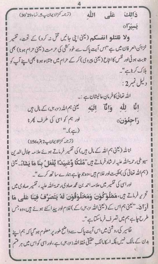 - Quranic Verse 1: "Don't kill yourself. No doubt Allah (swt) is merciful and anyone who does so, will be pushed in fire. And it is easy for Allah (swt)." (Nisa: 4:29, 4:30)